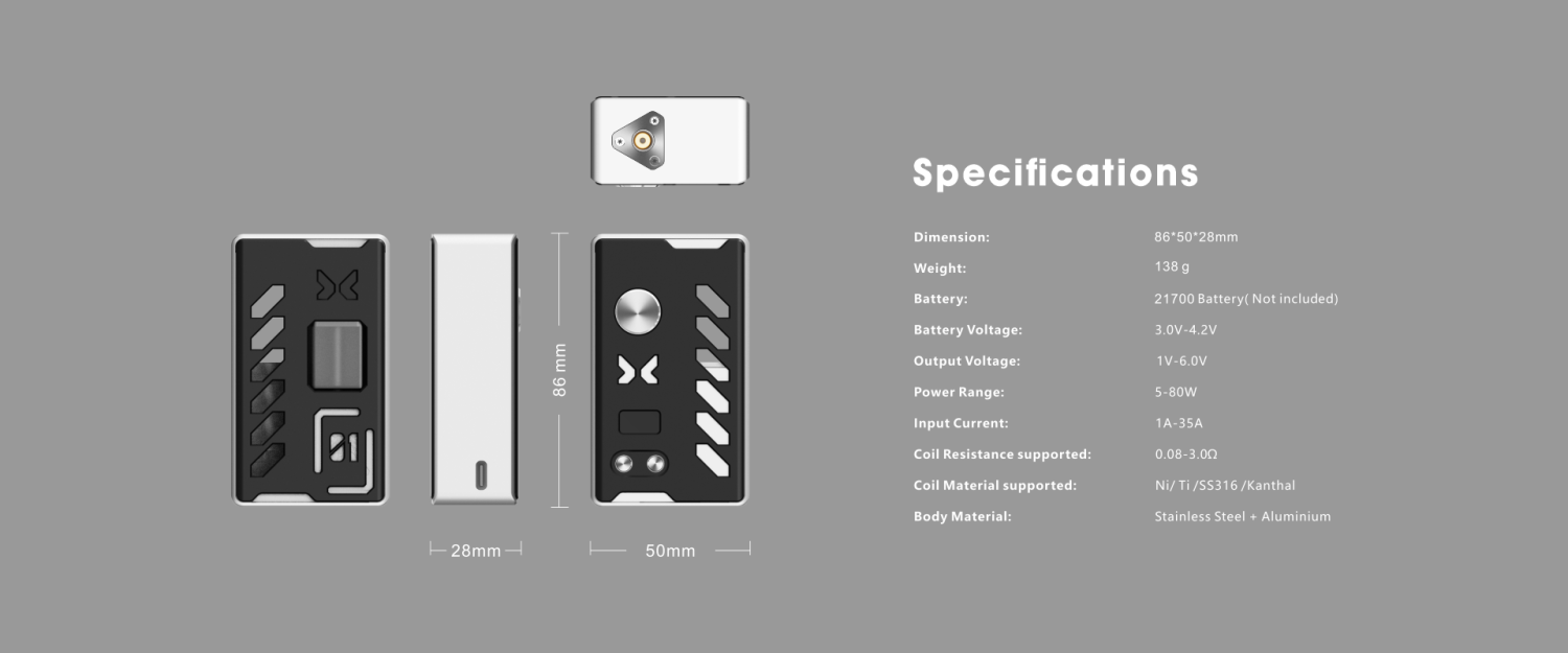 • Kompaktan i Ergonomski Dizajn: Visok samo 86 mm, širok 50 mm i debeo 28 mm, lako staje u ruku ili džep. Može smjestiti do 26 mm RDA bez previsa.