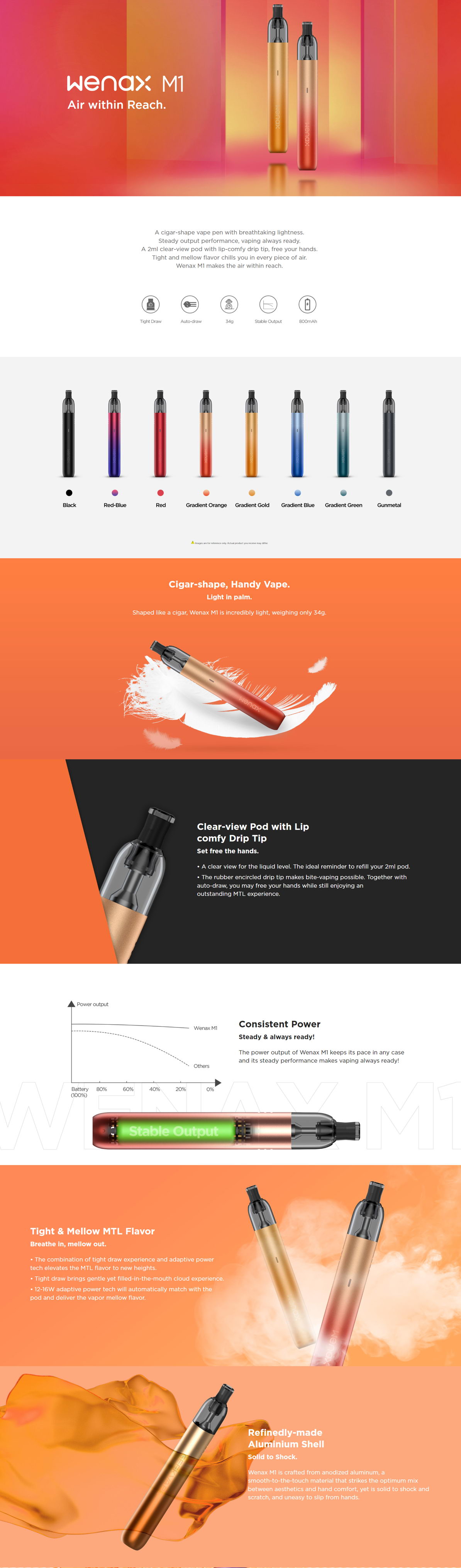 Tijelo M1 POD e-cigarete je izrađeno od aluminija pa je kompletan uređaj težak samo 34g. Tank ima kapacitet od 2ml i u njemu je ugrađen grijač, a integrirana baterija je kapaciteta 800mah. Wenax M1 predstavlja sjajan izbor za korisnike koji traže jednostavan uređaj malih dimenzija, koji će pružiti dobru aromu i biti lak za korištenje.