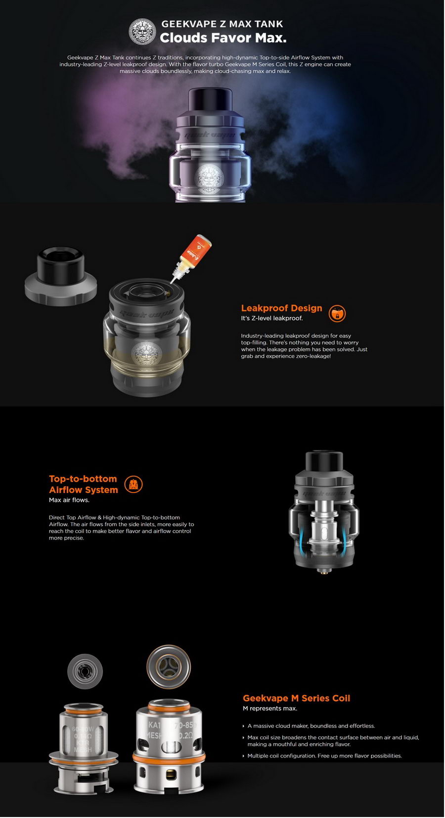 Geekvape Z MAX Subohm atomizer. Novi model u Zeus kolekciji atomizera kompanije GeekVape je Z Max iliti Zeus Max Subohm. Namenjen je najzahtevnijim korisnicima za korišćenje uvlačenjem direkt u pluća (DTL).