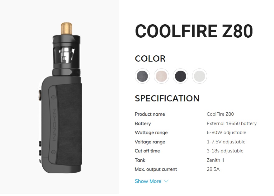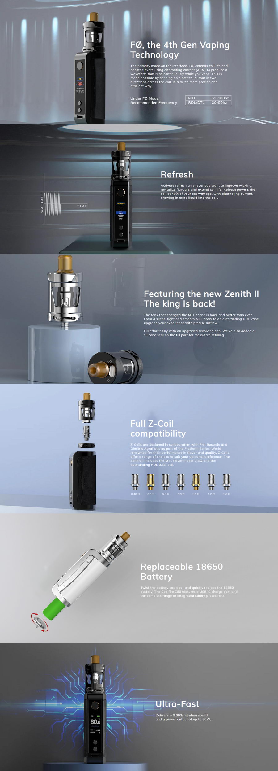 Innokin Coolfire Z80 + Zenith II Kit. Zenith II, unaprijeđena verzija planetarno popularnih Zenith i Zenith Pro isparivača, spojena sa Coolfire Z80 baterijskim modom nove generacije, daje kombinaciju koja je veoma jednostavna za korištenje, ali svojim performansama osigurava užitak kako apsolutnim početnicima tako i naprednim vaperima.