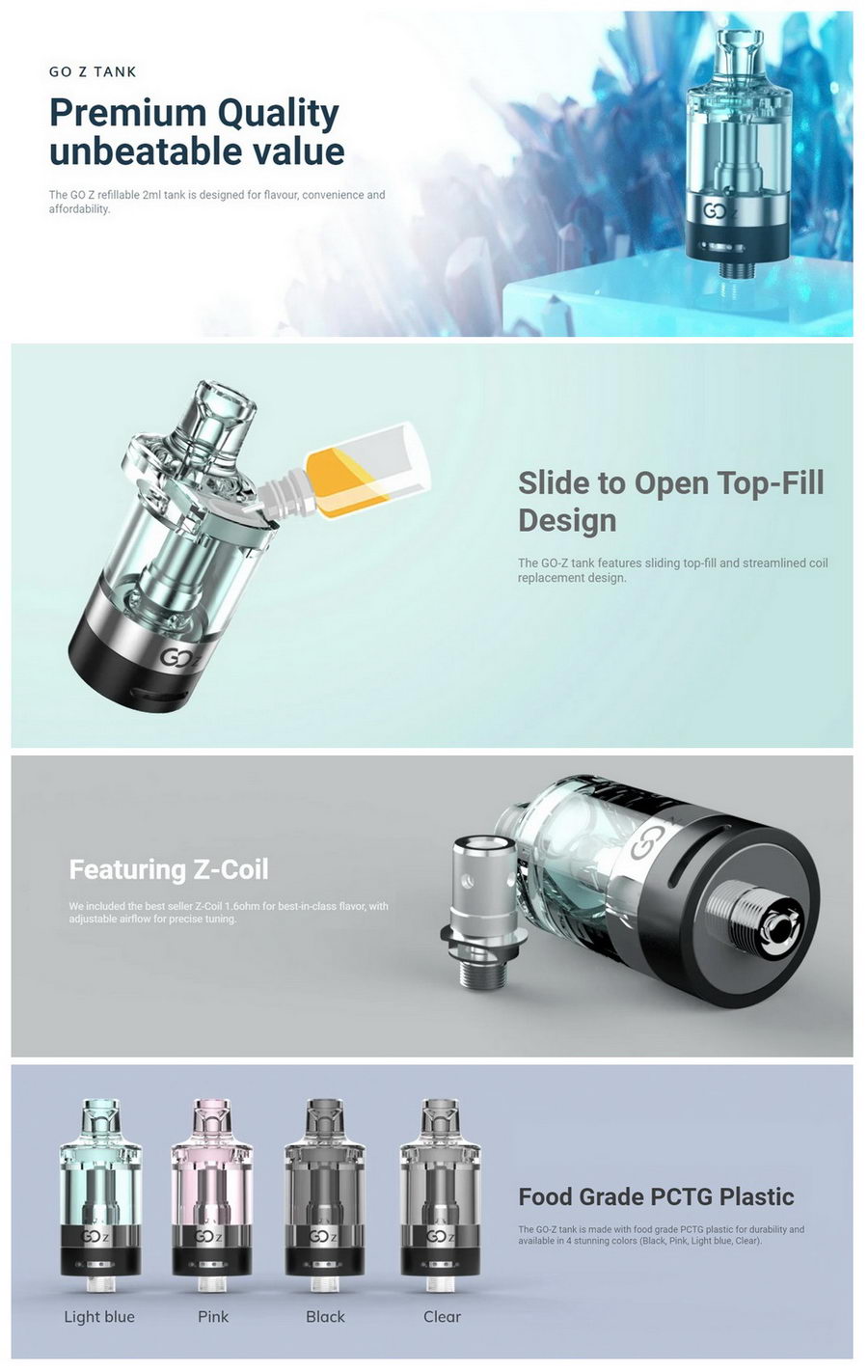 U kompletu je glava od 1.6 oma, predviđena za klasično MTL korišćenje. Osim ove, za GoZ su odgovarajuće i glave od 0.8 oma i 1.2 oma. Druge modele Z-Coil zamenskih glava nije preporučljivo koristiti na ovom atomizeru, jer traže veću snagu.