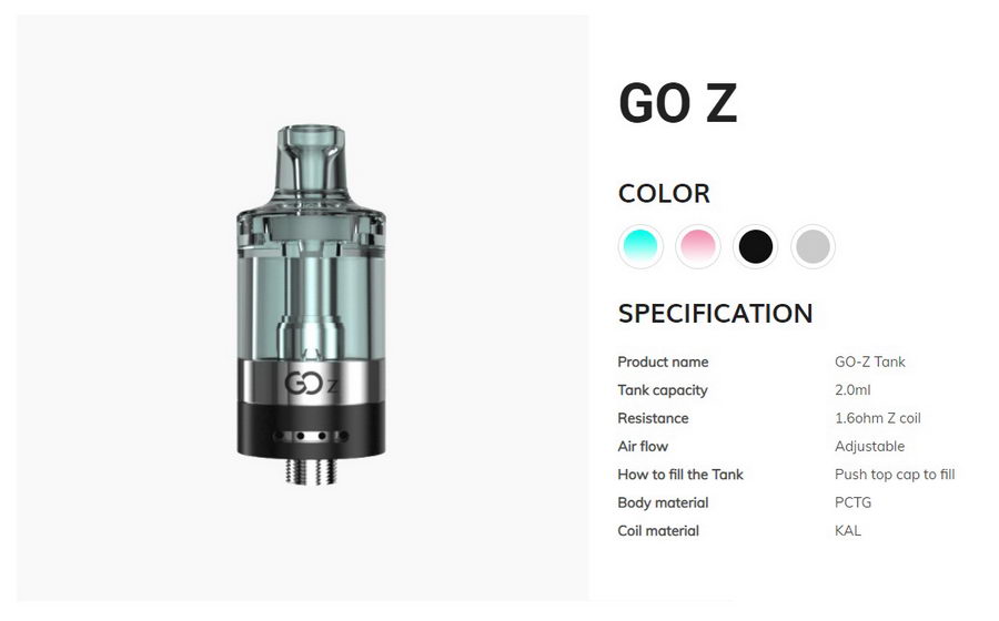 Innokin GoZ atomizer je širok 20mm. Kapacitet tanka je 2ml. Izrađen je od visoko kvalitetne PCTG plastike, zbog čega je veoma lagan a tank je skoro u potpunosti providan. GoZ poseduje klasičan 510 konektor, pa se može koristiti sa svim standardnim baterijama i baterijskim modovima.
